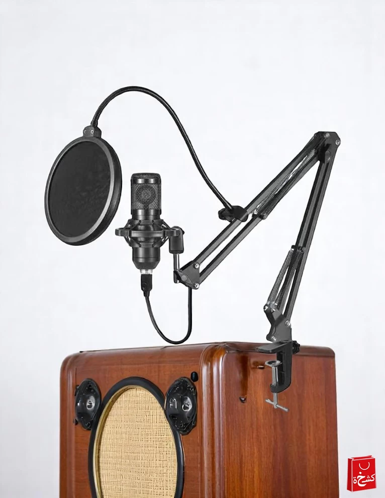مجموعة شاملة متكاملة – تشمل ميكروفون استوديو مكثف، ذراع قابل للتعديل، فلتر هواء، غطاء ميكروفون، ولوحة تحكم صوتية احترافية