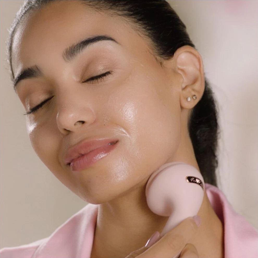 3️⃣ مرّري الجهاز بلطف بحركات دائرية على كامل الوجه لمدة 60–90 ثانية.