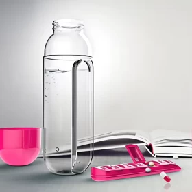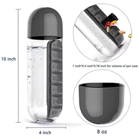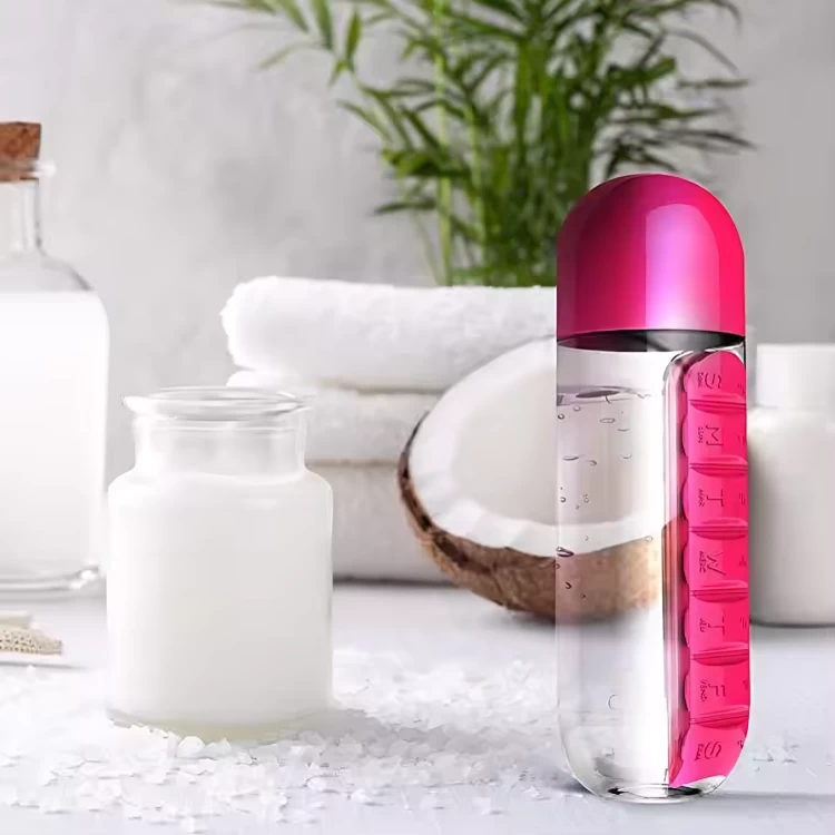 زجاجة ماء مع منظم الأدوية والفيتامينات