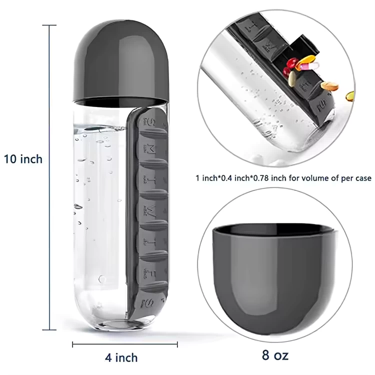• 🥤 تصميم 2 في 1 – زجاجة ماء مع علبة حبوب مدمجة.