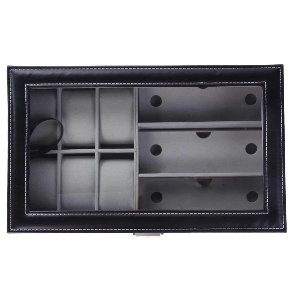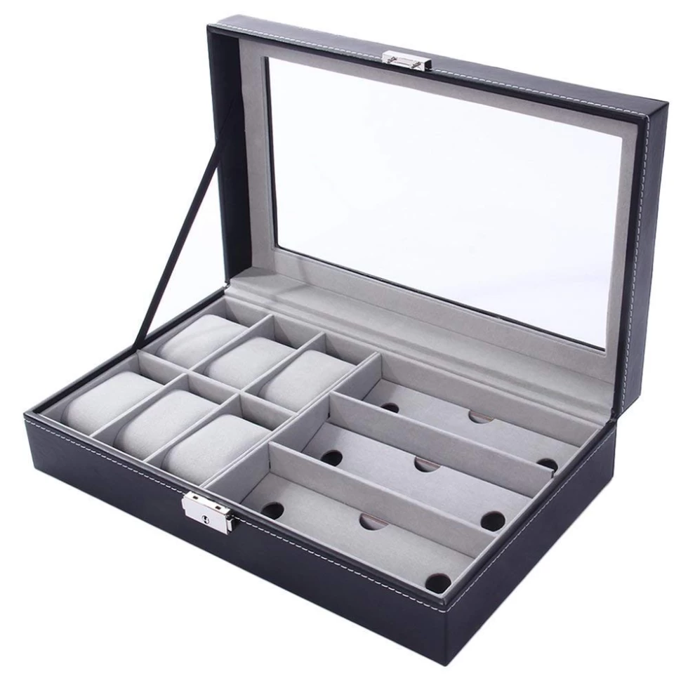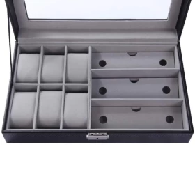 ⌚✨ منظم ساعات وإكسسوارات فاخر – جلد صناعي 6+3 فتحات مع غطاء شفاف