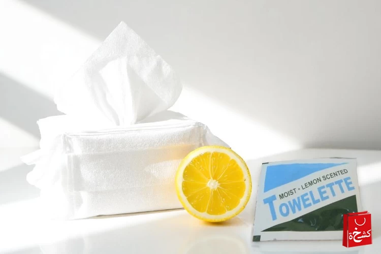 مناديل مبللة ناعمة وصغيرة الحجم برائحة الليمون المنعشة، مثالية للتنظيف السريع أثناء التنقل.