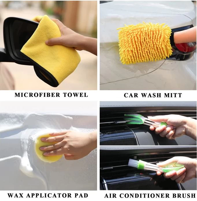 مجموعة أدوات تنظيف متكاملة – تشمل فوطة مايكروفايبر، قفاز غسيل، وسادتين لتطبيق الشمع، فرشاة الإطارات، فرشاة فتحات التكييف، مكشطة زجاج، أداة إزالة الحصى من الإطارات، وصندوق تخزين مرتب.