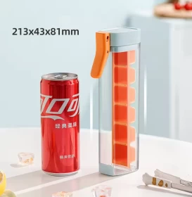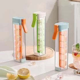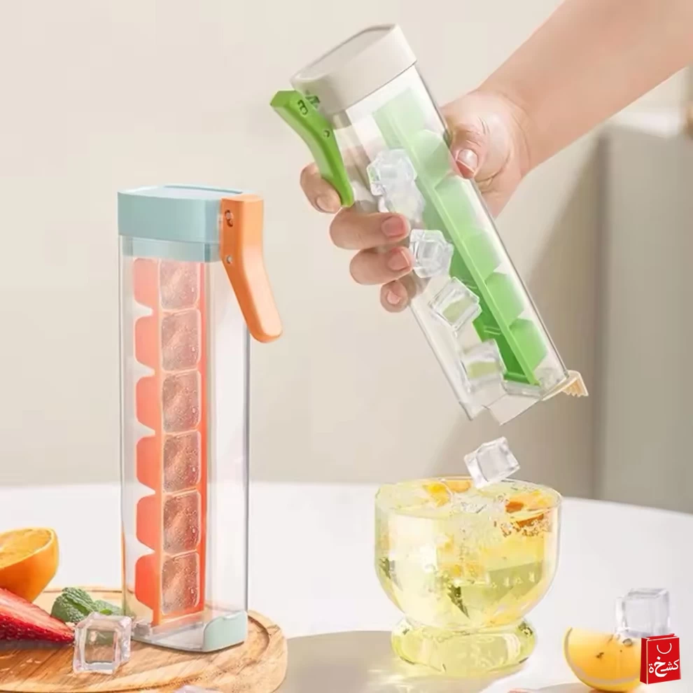زجاجة محمولة 2 في 1 لصنع مكعبات الثلج، تسمح لك بتجميد وحمل مكعبات الثلج بسهولة! ما عليك سوى ملؤها بالماء، وضعها في الفريزر، ثم لفّها لإخراج مكعبات الثلج فورًا 🌀🧊