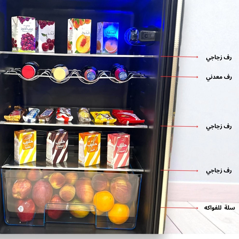 يتميز بباب زجاجي قابل للإغلاق بمفتاح، وإضاءة LED زرقاء أنيقة، ورفوف مرنة قابلة للتعديل، مما يجعله مثاليًا للمنازل، المكاتب، الكافيهات، الصالونات، والمحلات التجارية.
