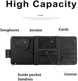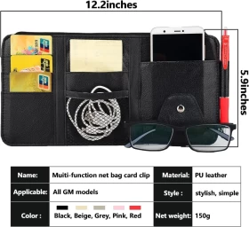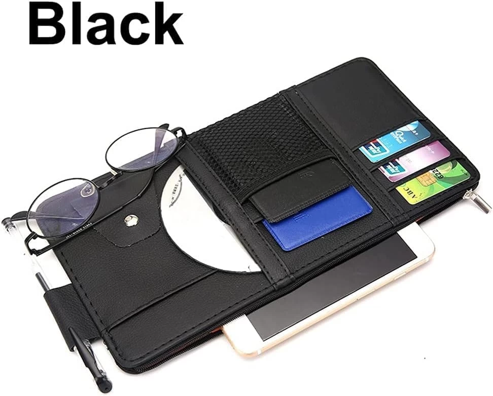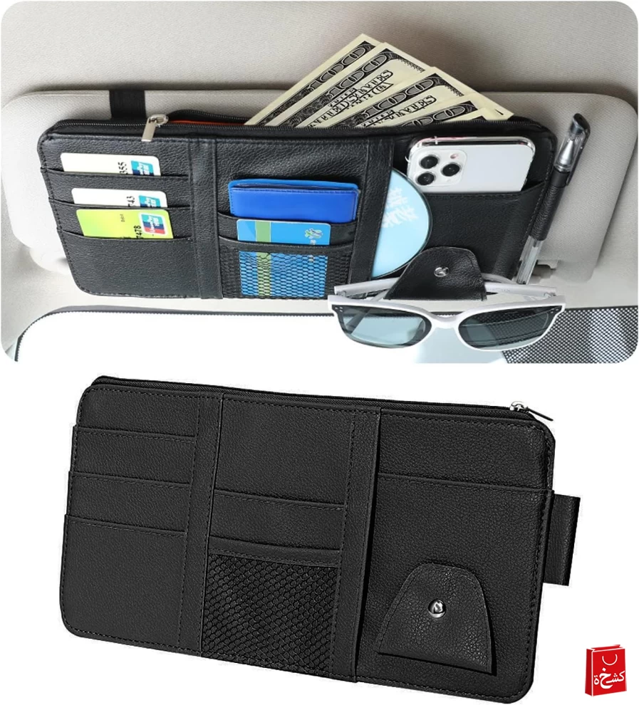 حافظ على سيارتك منظمة مع منظم حاجب الشمس متعدد الوظائف! مصنوع من جلد صناعي عالي الجودة، يحتوي على جيوب متعددة، وسحاب، وحامل مخصص للنظارات الشمسية – مثالي لحمل البطاقات، الأقلام، الكابلات والمزيد.