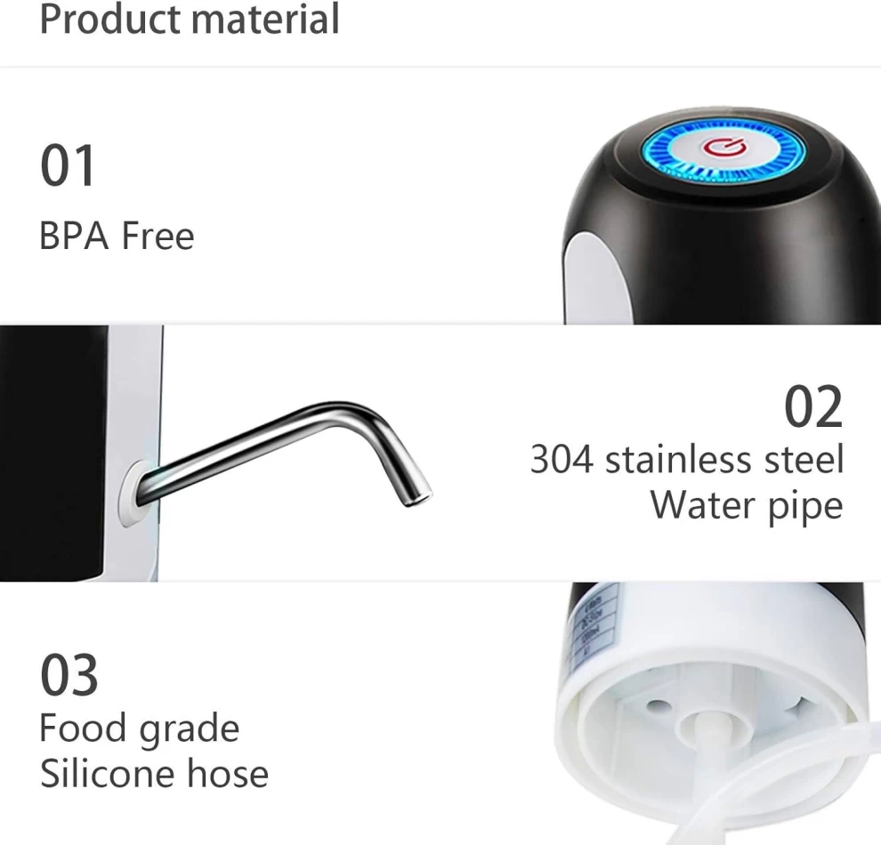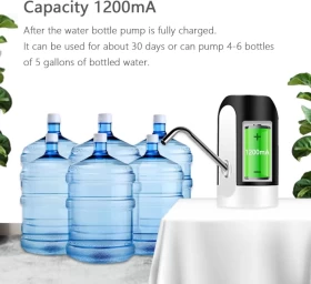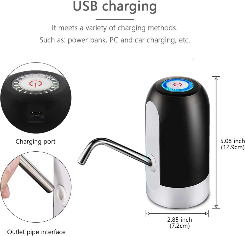اشرب الماء بسهولة وراحة مع مضخة المياه القابلة لإعادة الشحن عبر USB. مثالية للاستخدام في المنزل، المكتب، السفر، والمخيمات، وتتناسب مع معظم زجاجات الجالون القياسية، وتعمل بزر واحد لتوزيع الماء بدون فوضى.
