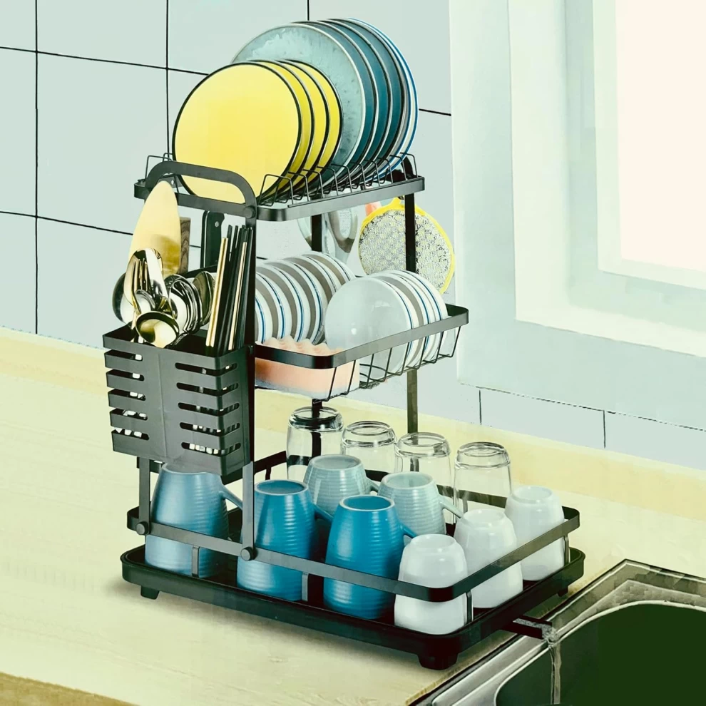 استفد من مساحة مطبخك مع رف الصحون الأنيق المقاوم للصدأ بثلاث طبقات. مثالي لترتيب الصحون، الأطباق، الأكواب، وأدوات المطبخ مع الحفاظ على سطح المطبخ نظيفاً وجافاً.