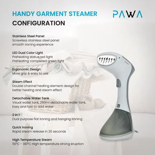 قل وداعًا للتجاعيد مع جهاز بخار الملابس المحمول Pawa بقوة 1300 واط. خفيف الوزن، عملي وقوي، يسخن خلال ثوانٍ معدودة ليمنحك ملابس أنيقة ومرتبة في أي وقت. مثالي للاستخدام في المنزل، السفر أو المكتب لإطلالة احترافية وسريعة.