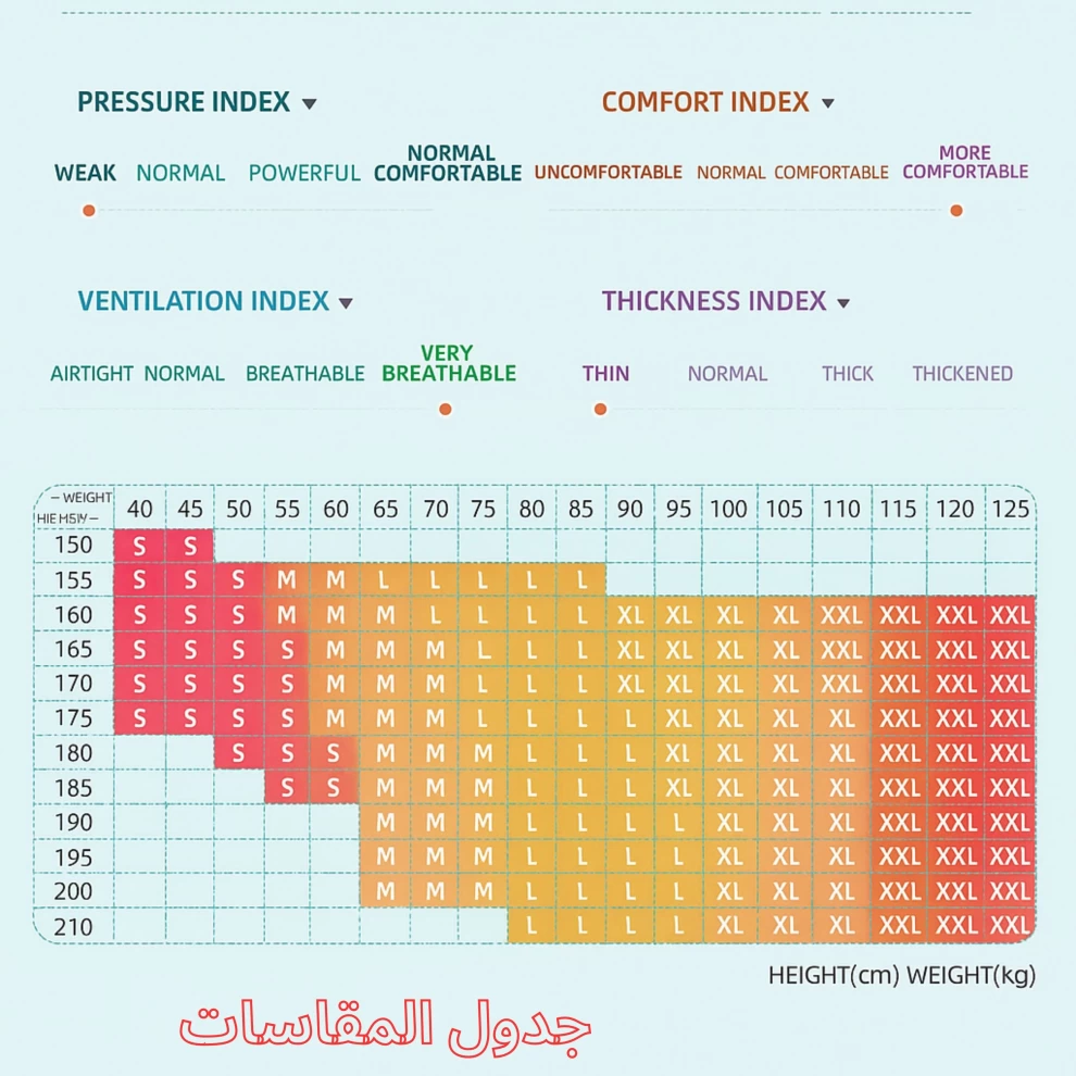 كل مقاس مصمم بعناية لتحقيق التوازن المثالي بين الضغط والراحة والتهوية والسماكة لضمان أفضل ملاءمة لجسمك.