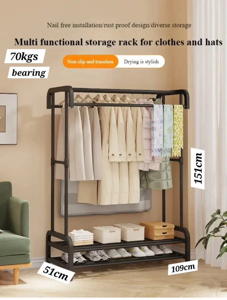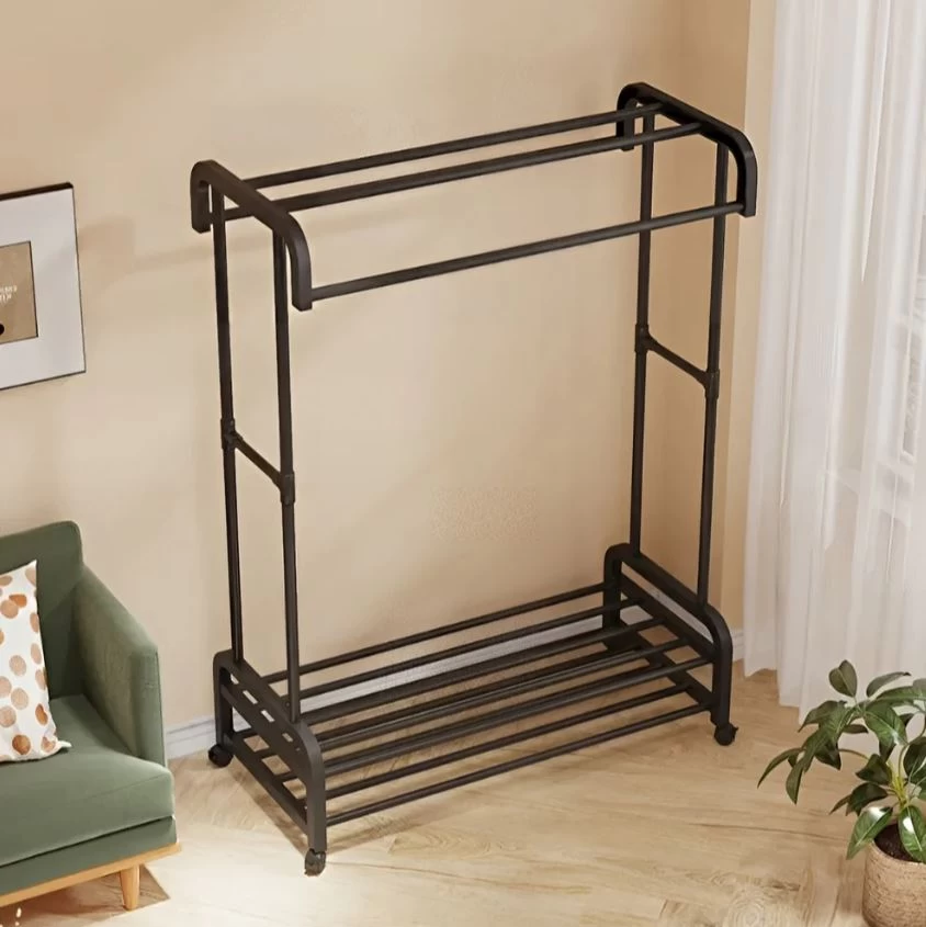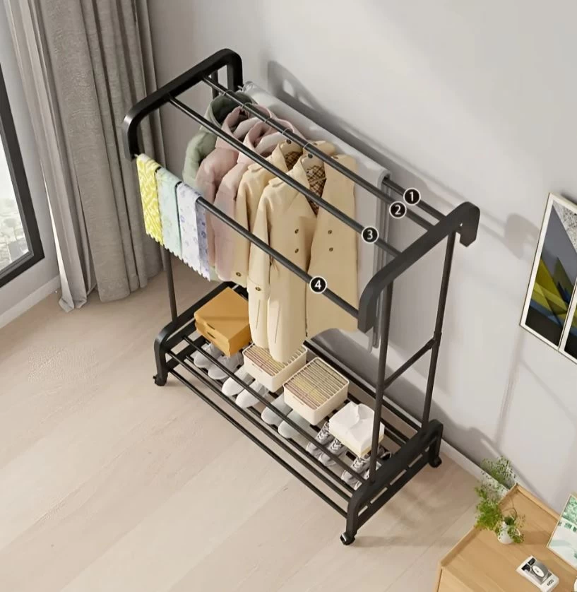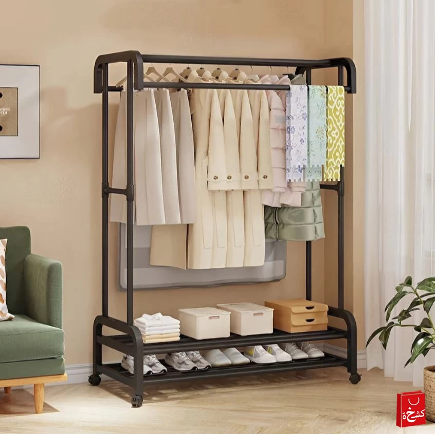 حافظ على ترتيب ملابسك وأحذيتك وإكسسواراتك مع علاقة الملابس المعدنية المزدوجة. تتميز بقضيبين للتعليق وصناديق تخزين سفلية لتوفير مساحة أكبر وتنظيم مثالي. تصميمها الأنيق والمتين يجعلها مناسبة لغرف النوم وغرف الغسيل والمداخل.