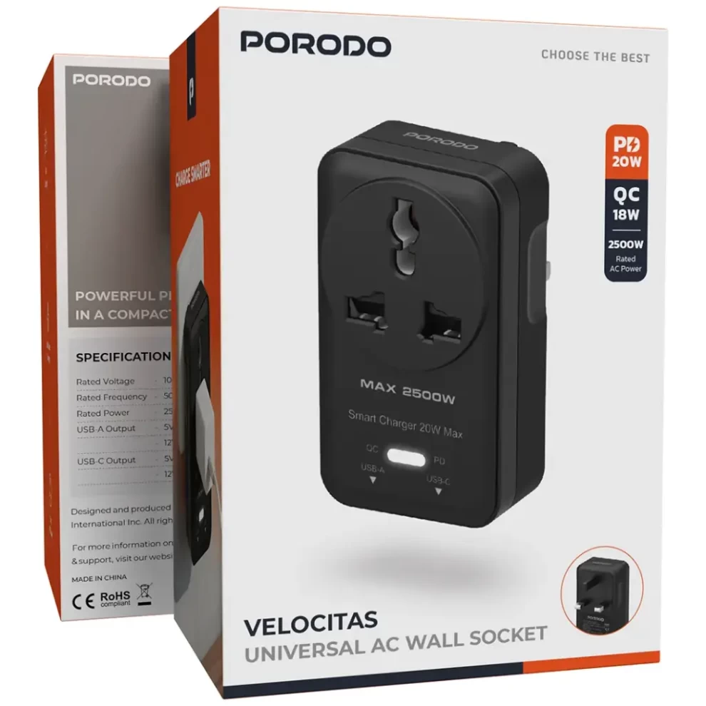 🔌⚡ مقبس حائط كهرباء عالمي Porodo Velocitas|