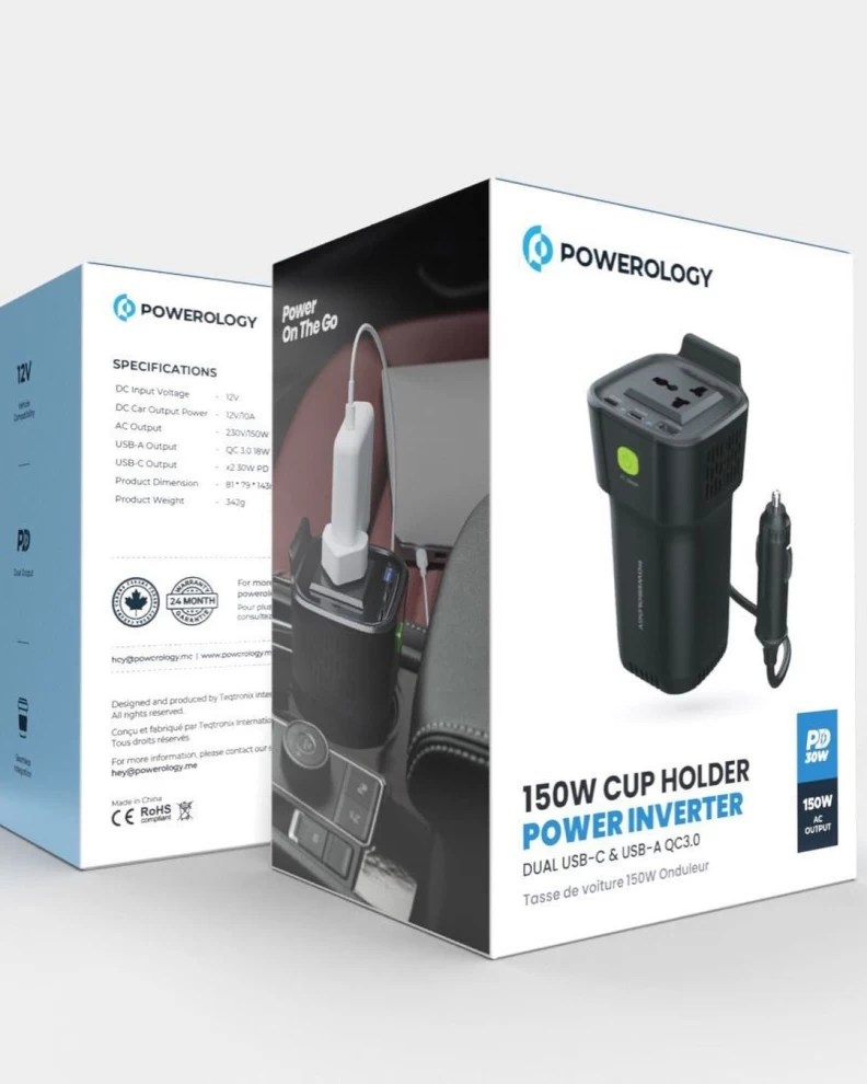 • 1 × محول طاقة Powerology 150 واط لحامل الأكواب