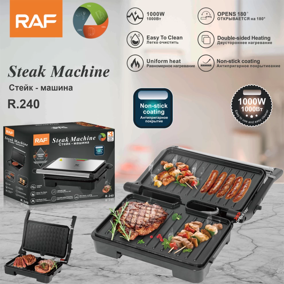 اشوي مثل المحترفين في المنزل مع شواية RAF 180° للستيك. مع تصميمها القابل للفتح 180° وقوة 1000 واط، تتيح لك هذه الأداة المتعددة الاستخدامات طهي الستيك، الساندويشات، الخضروات والمزيد بشكل متساوٍ وفعال. مثالية للمطابخ المنزلية والشقق الصغيرة وعشاق الستيك للحصول على وجبات مشوية طرية ولذيذة كل مرة.