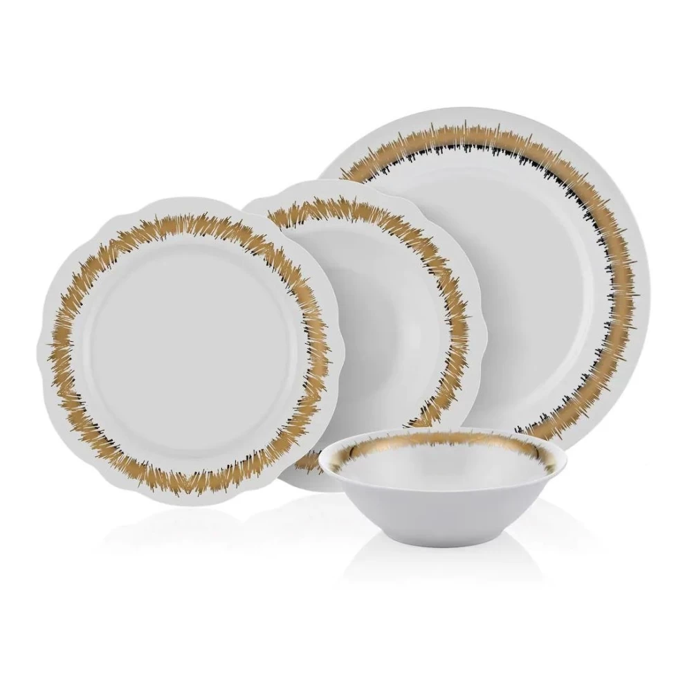 طقم عشاء سيراميك أبيض وذهبي – 24 قطعة (صحون وأوعية)