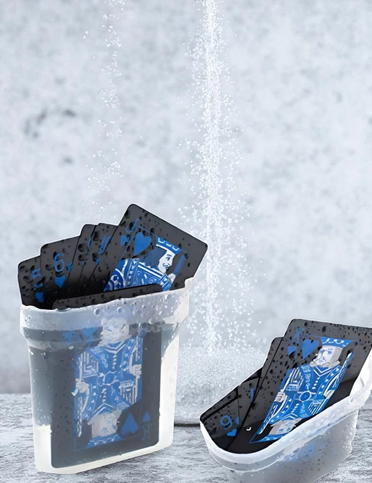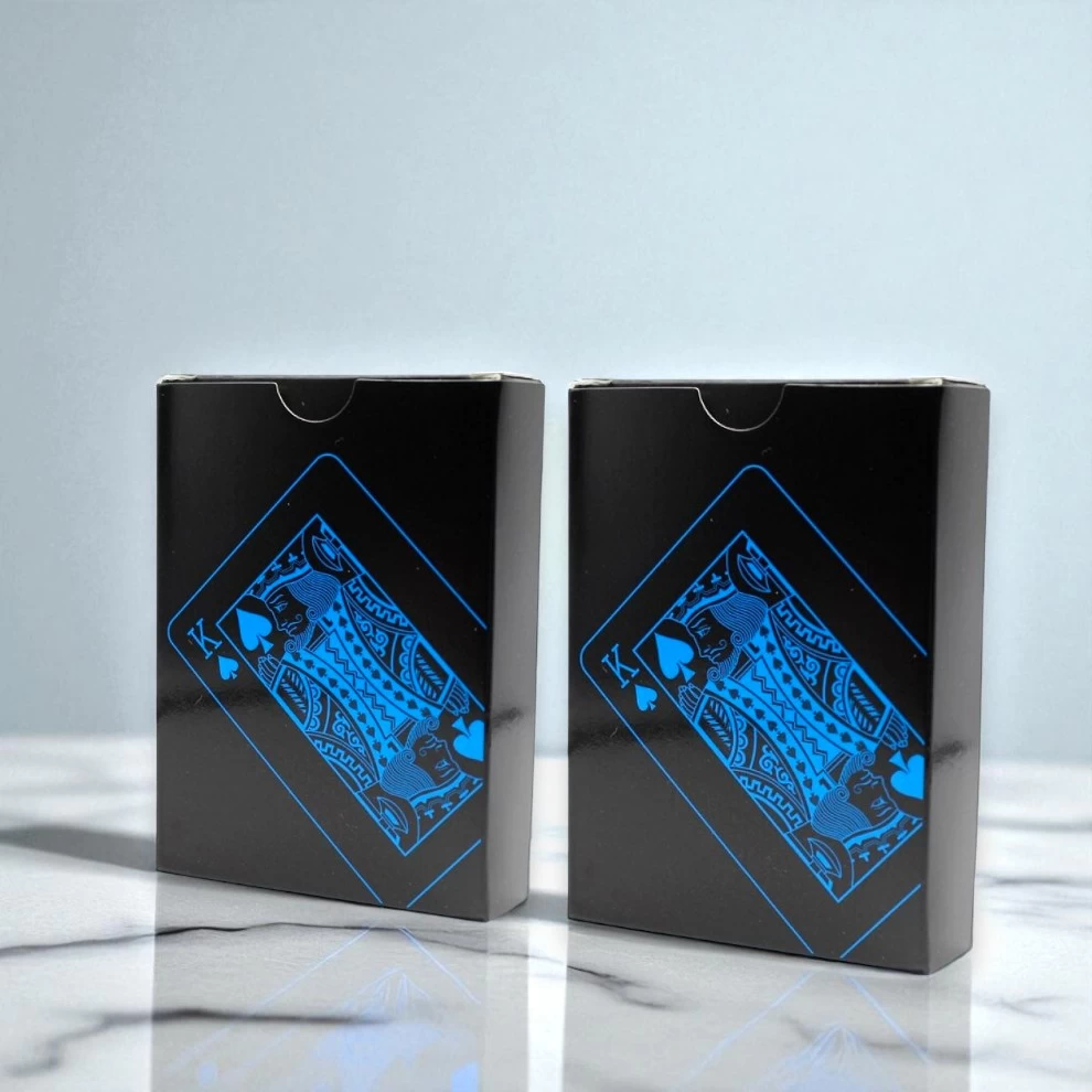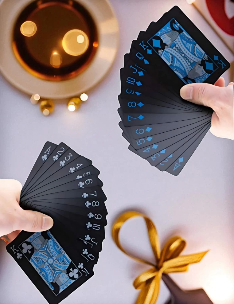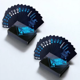 ارتقِ بأجواء ألعابك مع هذه المجموعة الأنيقة والمقاومة للماء من أوراق اللعب السوداء! مصنوعة من مادة PVC عالية الجودة، بلمسة نهائية سوداء غير لامعة، تقاوم التآكل والانسكابات والانحناء — مما يجعلها مثالية للاستخدام داخل المنزل أو في الخارج. سواء كنت تلعب البوكر في المنزل أو تستمتع بالألعاب بجانب المسبح، فهذه المجموعة المزدوجة توفر المتانة والأناقة في آنٍ واحد. استمتع بتجربة لعب ممتعة في أي مكان!