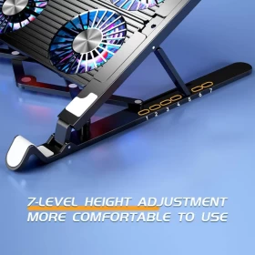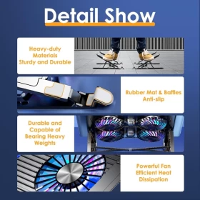 • Ultra Quiet 4-core Fan with LED Lights: This laptop cooling pad is equipped with an ultra-quiet 4-core fan that provides powerful cooling while keeping a low noise level, allowing you to focus on work or entertainment without distractions. Additionally, the fan comes with LED lights that add a touch of fashion and technology to your using environment
