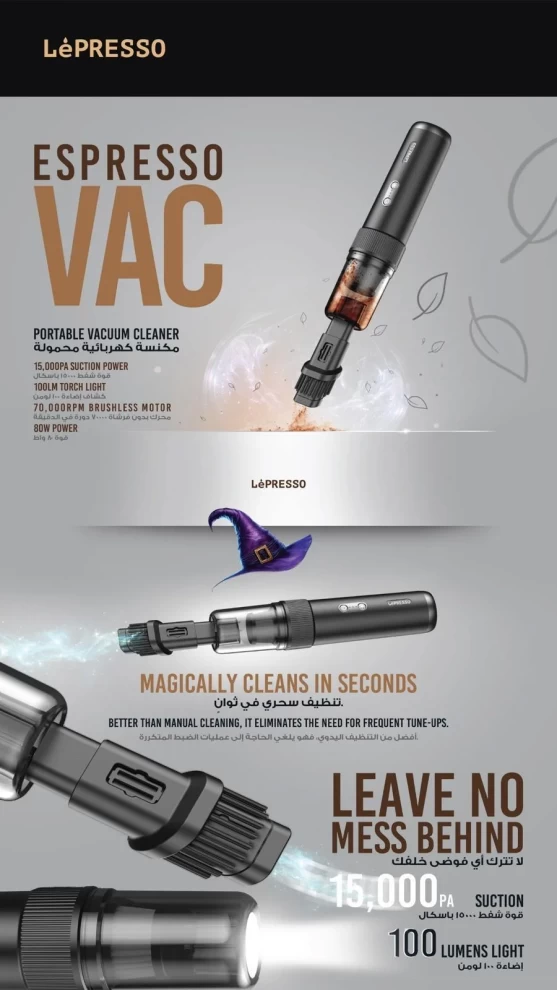 Keep your space clean anytime, anywhere with the LePresso Espressovac Portable Vacuum Cleaner. Lightweight, compact, and cordless, it’s perfect for home, office, car, and travel use. Designed for quick cleanup of dust, crumbs, and small debris, this portable vacuum makes cleaning effortless and efficient.